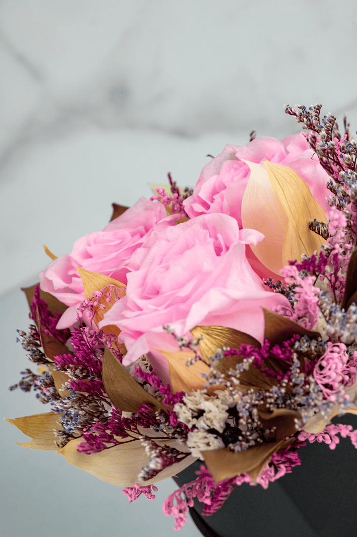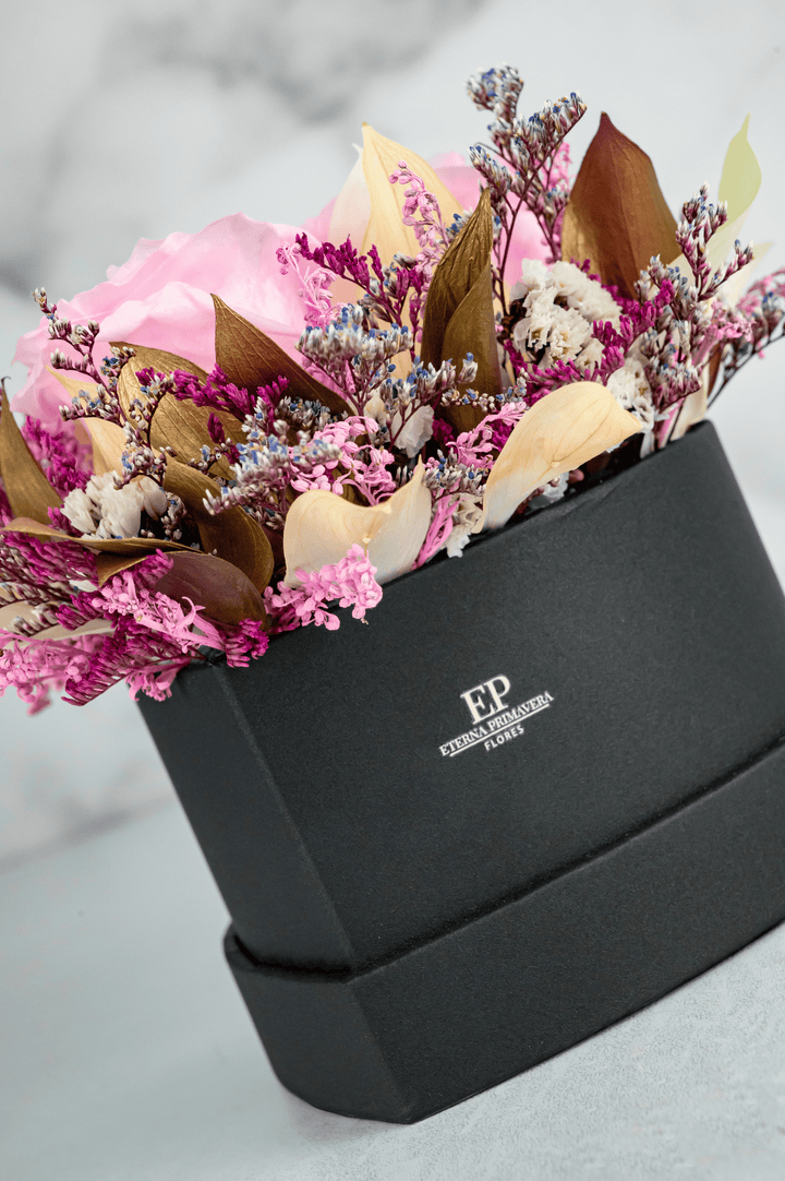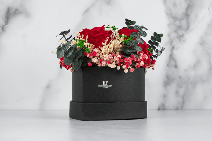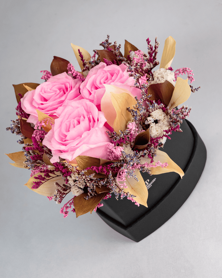 Delicado y romántico, este mini arreglo combina rosas preservadas con finos follajes secos y flores naturales en tonos dorados y púrpuras. Su elegante caja negra en forma de corazón lo convierte en el regalo ideal para expresar amor, gratitud o amistad con un detalle que perdura en el tiempo.