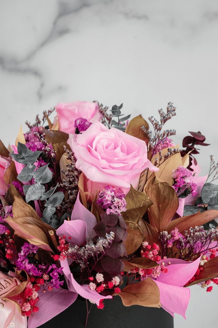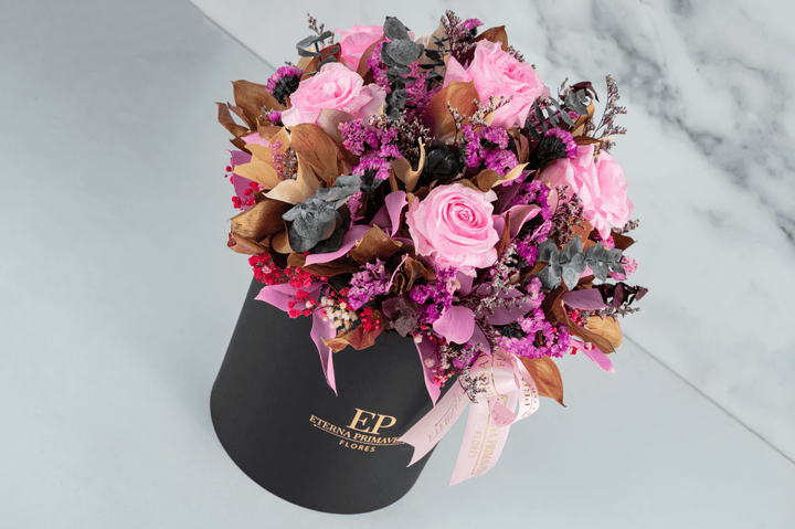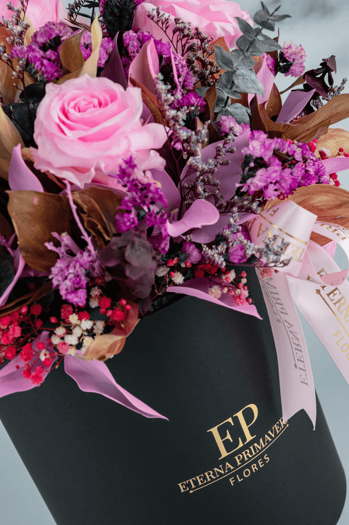 Elegancia que perdura. Este arreglo floral preservado de Eterna Primavera combina la belleza eterna de las rosas rosadas con una delicada mezcla de flores secas y follajes naturales en tonos vibrantes. Cada elemento ha sido cuidadosamente tratado para conservar su color y textura durante años, sin necesidad de agua ni mantenimiento.