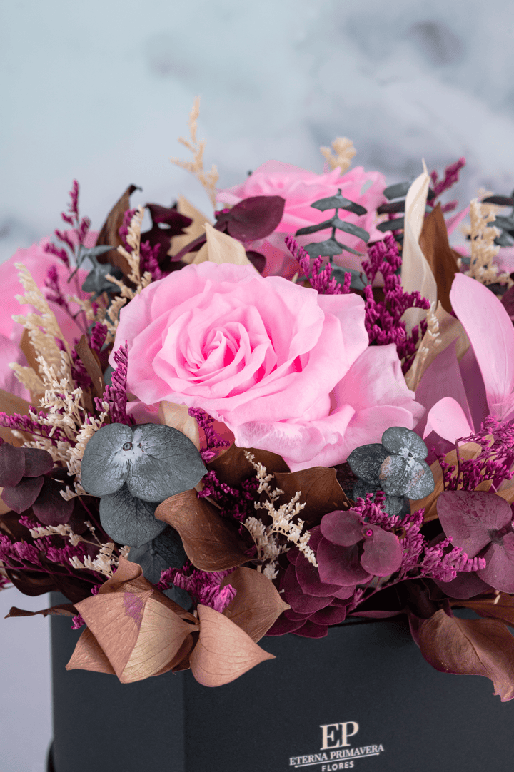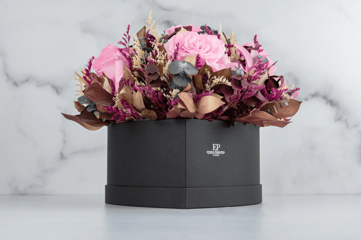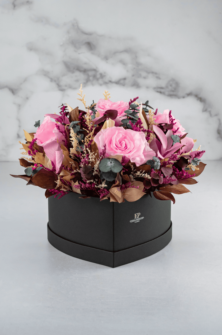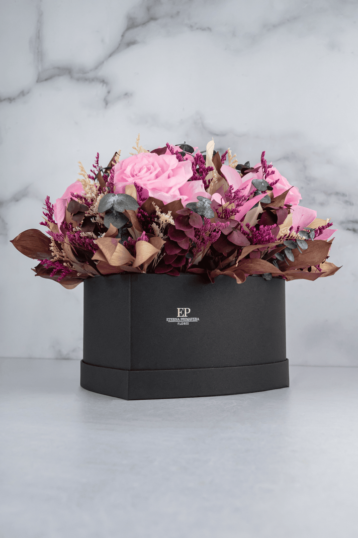 Sorprende con la elegancia y delicadeza de este exclusivo arreglo de rosas preservadas rosadas, combinadas con follajes naturales y flores secas en tonos dorados y vino. Presentadas en una sofisticada caja en forma de corazón, este diseño es ideal para regalar amor, gratitud o admiración en cualquier ocasión especial.