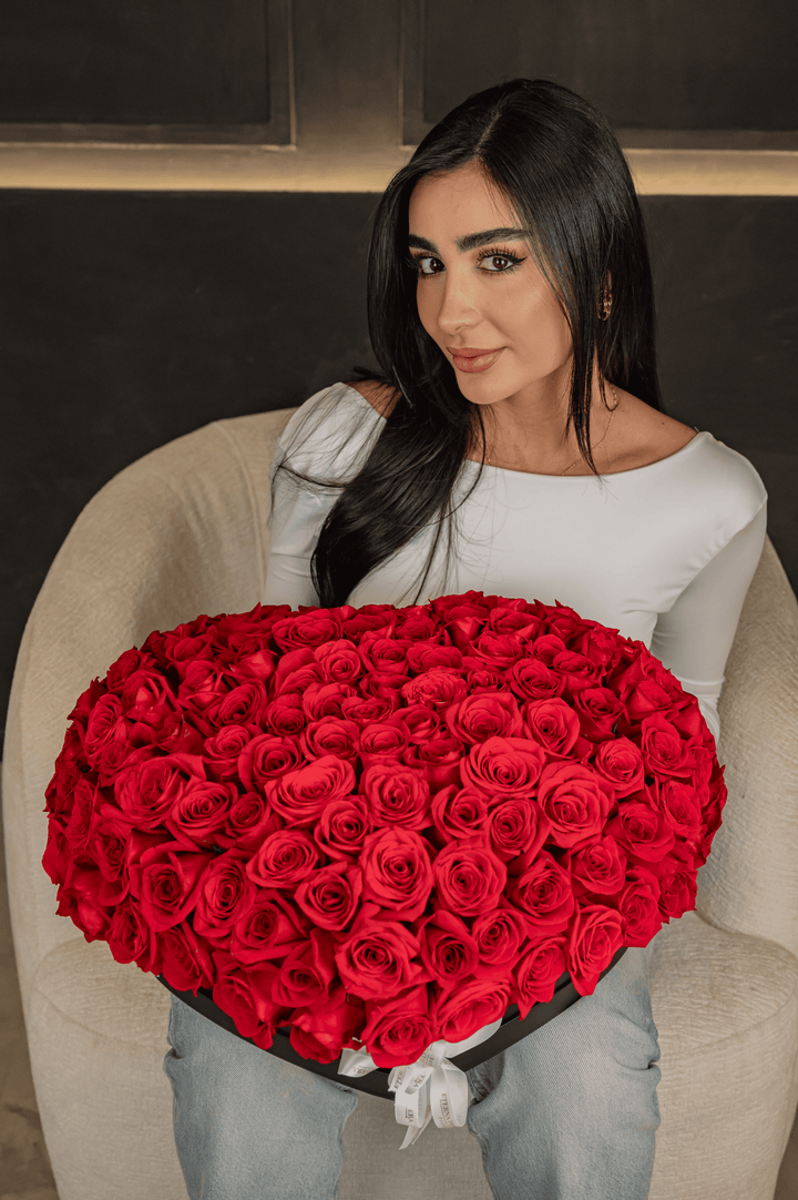 La presentación en una elegante caja negra resalta la intensidad del rojo vibrante de las rosas, convirtiéndolo en un obsequio inolvidable y digno de los momentos más importantes.