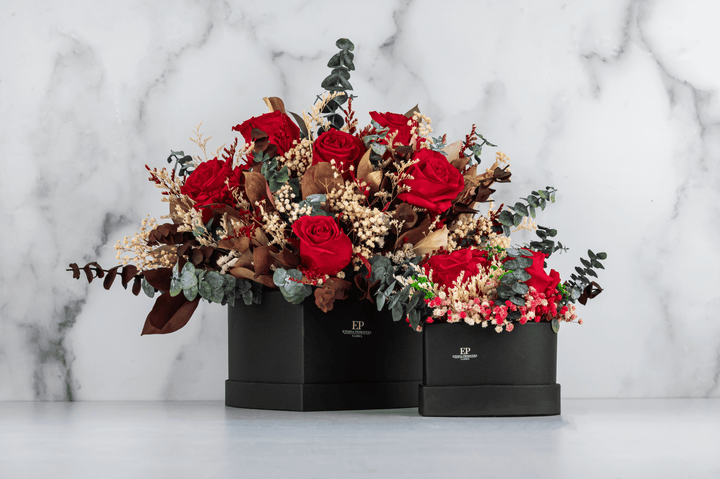 Lleva la elegancia natural al siguiente nivel con este espectacular arreglo de rosas eternas rojas, cuidadosamente elaborado con follajes preservados y secos que resaltan la belleza atemporal de cada flor. Presentado en una caja de lujo en forma de corazón negra con el logo dorado de Eterna Primavera Flores, este diseño floral de alta gama es el regalo perfecto para transmitir amor, admiración y sofisticación.