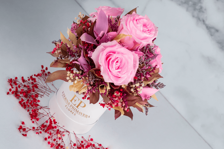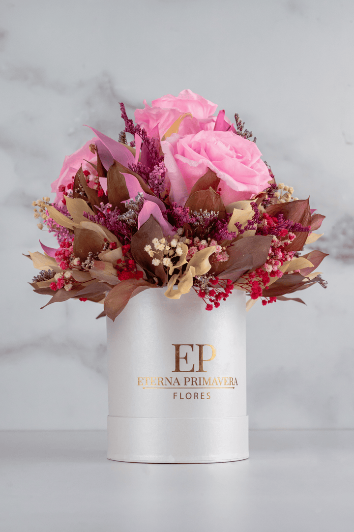 Dulzura, elegancia y amor en un solo detalle. Nuestro arreglo floral con rosas rosadas es una creación exclusiva de Eterna Primavera, diseñada para transmitir ternura, gratitud y cariño sincero. Cada rosa es seleccionada cuidadosamente por su color suave y frescura, combinada con flores preservadas y follajes secos que realzan su belleza.