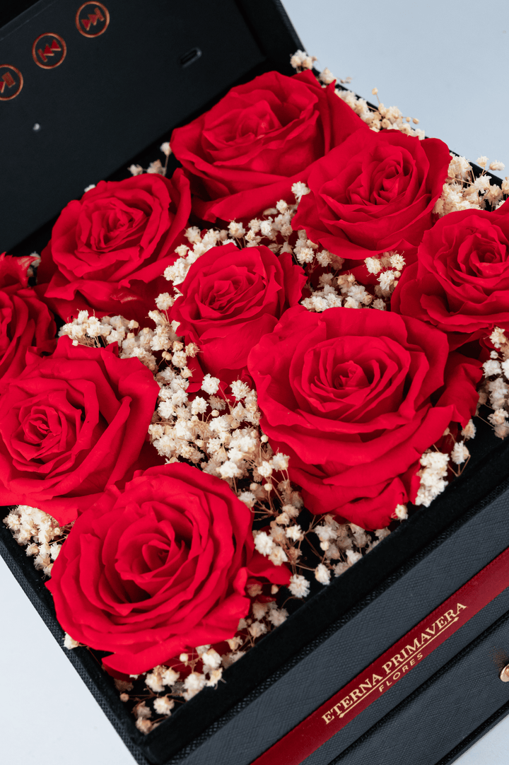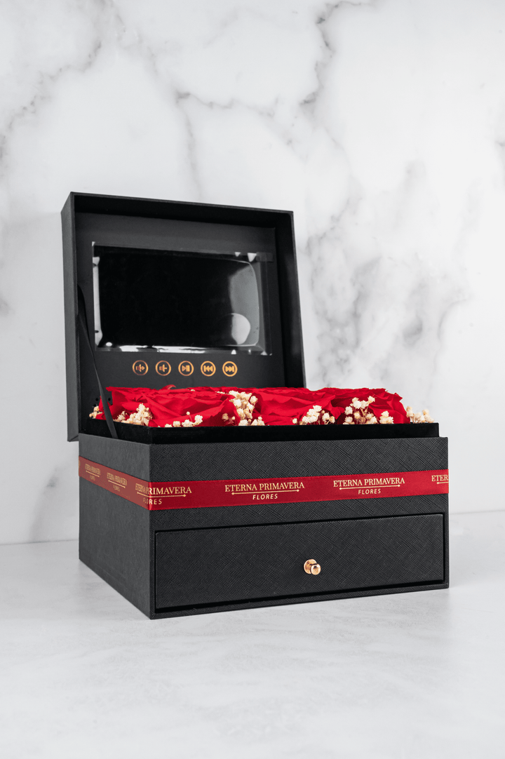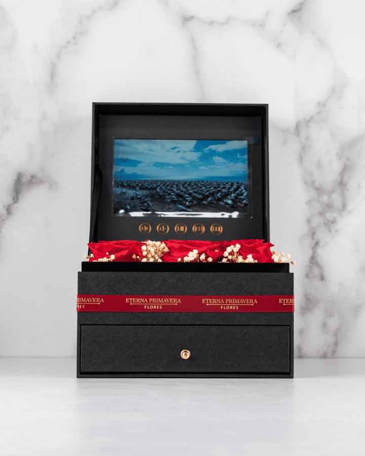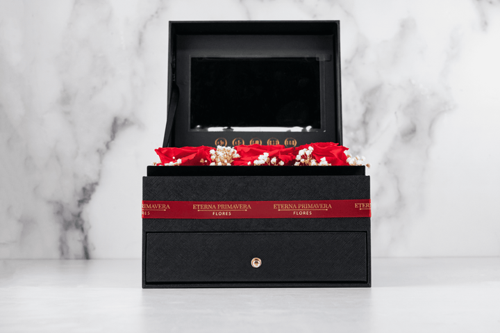 Sorprende con el regalo más exclusivo y emotivo: nuestra Caja Premium de Rosas Eternas de Eterna Primavera Flores, diseñada para capturar el corazón a primera vista. Este elegante cofre en acabado negro texturizado combina la belleza natural de rosas preservadas de alta duración con un toque tecnológico de última generación: una pantalla de video integrada HD para reproducir mensajes personalizados, recuerdos inolvidables o declaraciones de amor únicas.