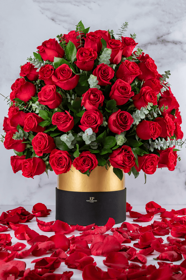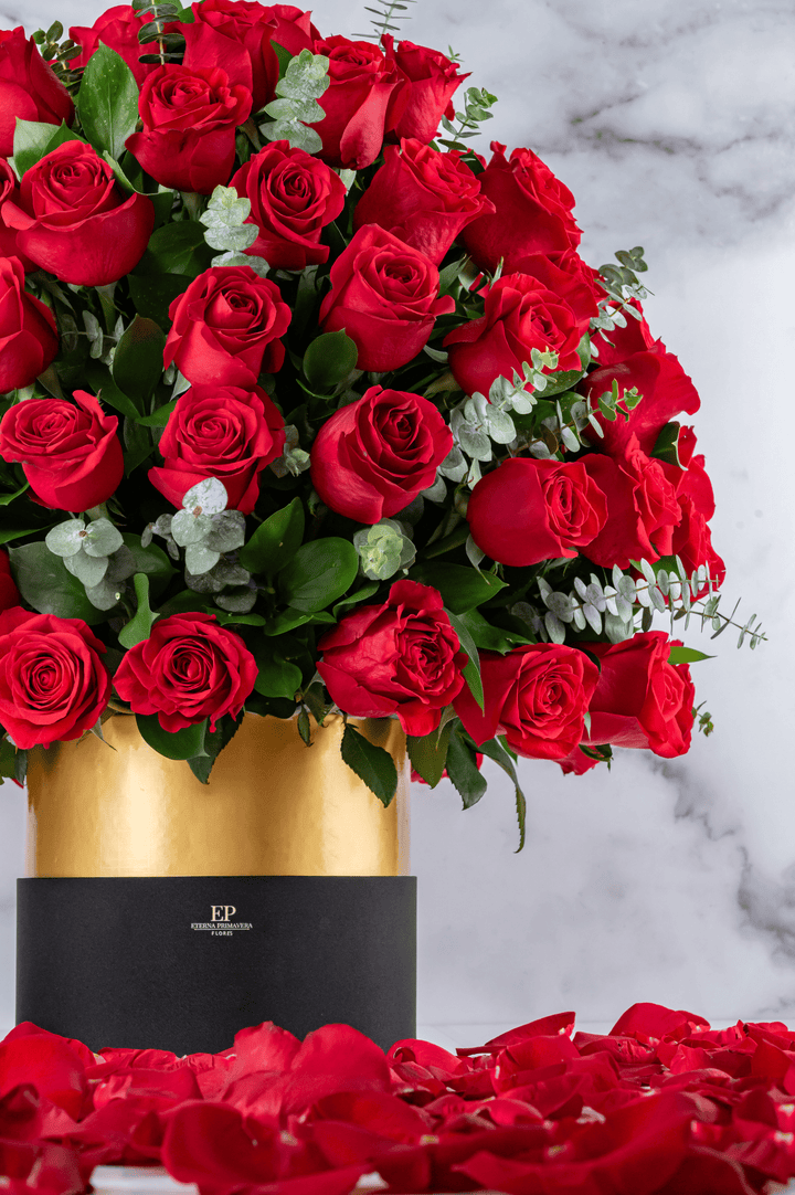 Perfecto para aniversarios, cumpleaños, San Valentín o declaraciones de amor, este diseño combina rosas ecuatorianas de tallo largo, hojas verdes naturales y un toque de eucalipto, creando una composición equilibrada y cautivadora.
